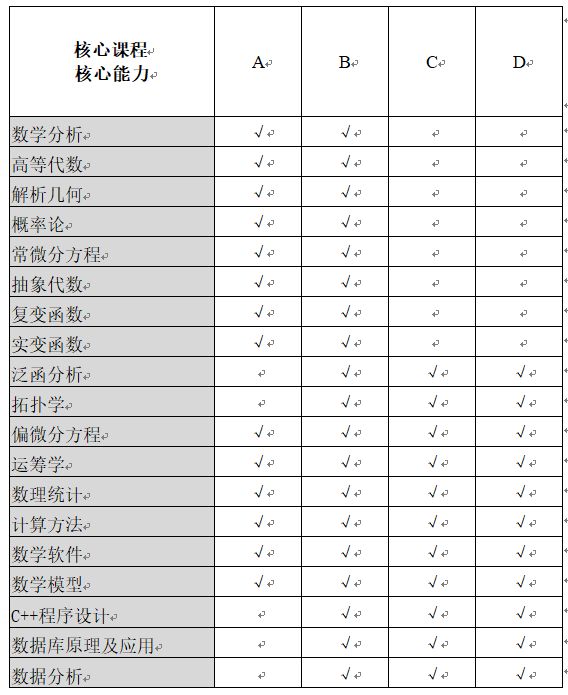 专业核心课程:数理统计、数学模型、实变函数、泛函分析、拓扑学基础、抽象代数、计算方法、运筹学、常微分方程、数据库原理及应用等。