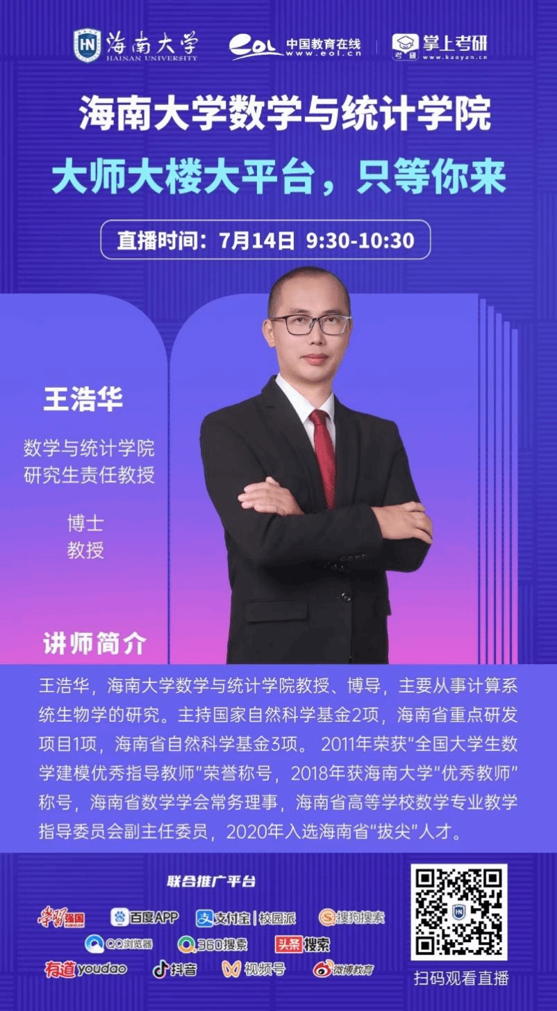 20247149:30-10:30Beat365官网教授、博导王浩华老师将对Beat365唯一官方网站研究生情况进行直播介绍,欢迎各位学子、家长和教师在直播时间内扫描海报上二维码观看直播和互动。