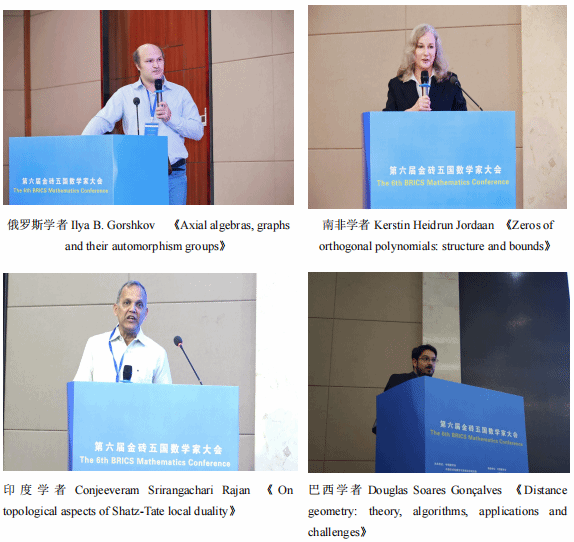 俄罗斯学者Ilya B. Gorshkov以《Axial algebras, graphs and their automorphism groups》为题作报告,Evgeny Tyrtyshnikov以《Theory and Applications of Tensor Decompositions》为题作报告,Victor Korolev以《Mixture-type probability models: analytics, asymptotics, applications》为题作报告;南非学者Kerstin Heidrun Jordaan以《Zeros of orthogonal polynomials: structure and bounds》为题作报告,Florian Luca以《Recent advances on the Skolem problem》为题作报告;印度学者Riddhipratim Basu以《First passage percolation: questions, conjectures and results》为题作报告,Anup Biswas以《Nonlocal Regularity Theory through the Lens of Ishii-Lions》为题作报告,Conjeeveram Srirangachari Rajan以《On topological aspects of Shatz-Tate local duality》为题作报告;巴西学者Renata Rojas Guerra以《Dynamic models for bounded random variables: how to forecast hydro-environmental indicators measured in rates and proportions?》为题作报告,Douglas Soares Gonçalves以《Distance geometry: theory, algorithms, applications and challenges》为题作报告;中国科学院数学与系统科学研究院研究员李培军以《Inverse problems for stochastic diffusion equations》为题作报告,复旦大学谷超豪研究所长聘教授王国祯以《Computations of stable homotopy groups and the classification of homotopy spheres》为题作报告,清华大学教授杨宇红以《Optimal Adversarial Learning For Nonparametric Regression》为题作报告。